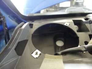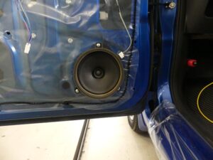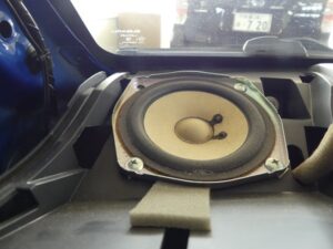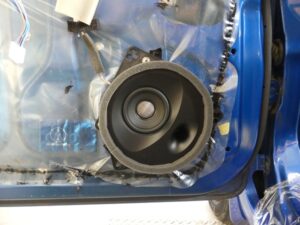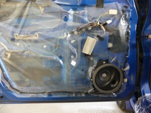 純正のスピーカーの開口部が小さく少しの加工で取付出来ますのでご安心ください。錆止め防水処理をしまして取付。